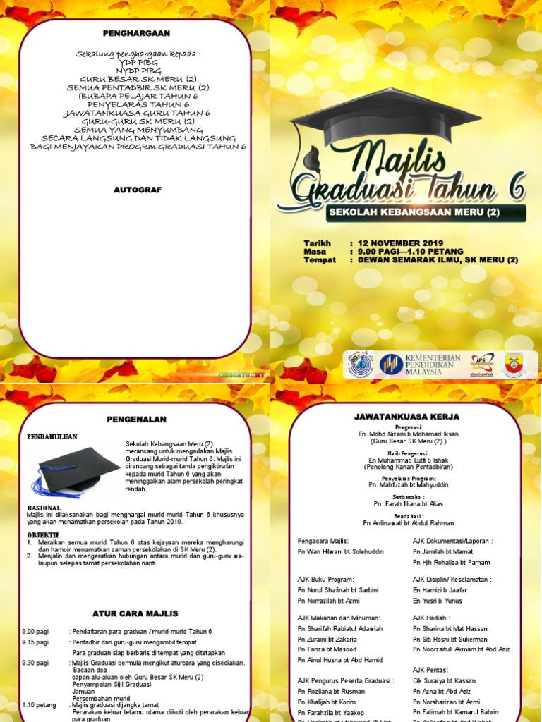 Buku Program Majlis Graduasi Tahun 6 Ini Saya Kongsikan Bersama Pengunjung Blog Ini Agar Kita Semua Sama Sama Beroleh Manfaat Dari Education Programming School Contoh buku aturcara untuk majlis sekolah. Muat turun contoh template buku program pelbagai tema seperti majlis perasmian persaraan perpisahan hari guru mesyuarat agung dan lain-lain. Share kegembiraan ini bersama rakan andaANDA BOLEH.